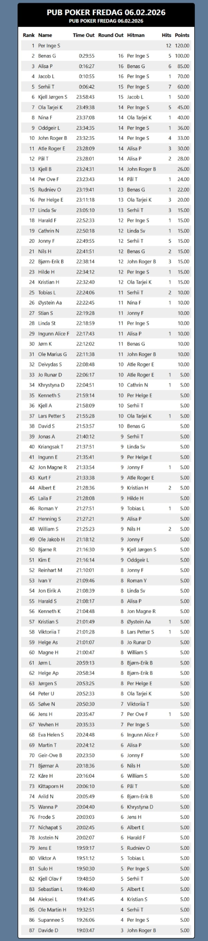 Resultat fredag 6 februar 2026