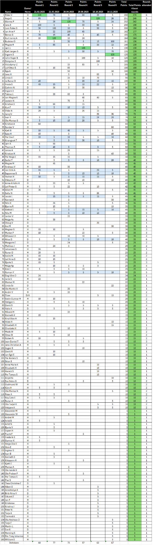 Sammenlagt resultat etter alle 6 runder i 2025 – summen av dei 4 beste rundene i grønn kolonne.
